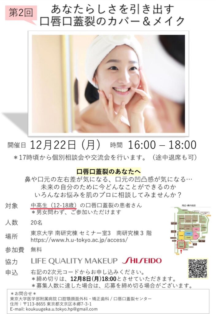 資生堂ライフクオリティーセンターのご担当者様より、カバーメイクの講習会開催のお知らせがございましたので、ご紹介させていただきます。中高生(12~18歳)の口唇口蓋裂当事者でご興味ある方いらっしゃいましたら是非参加してみてはいかがでしょうか?詳細は以下のとおりです。