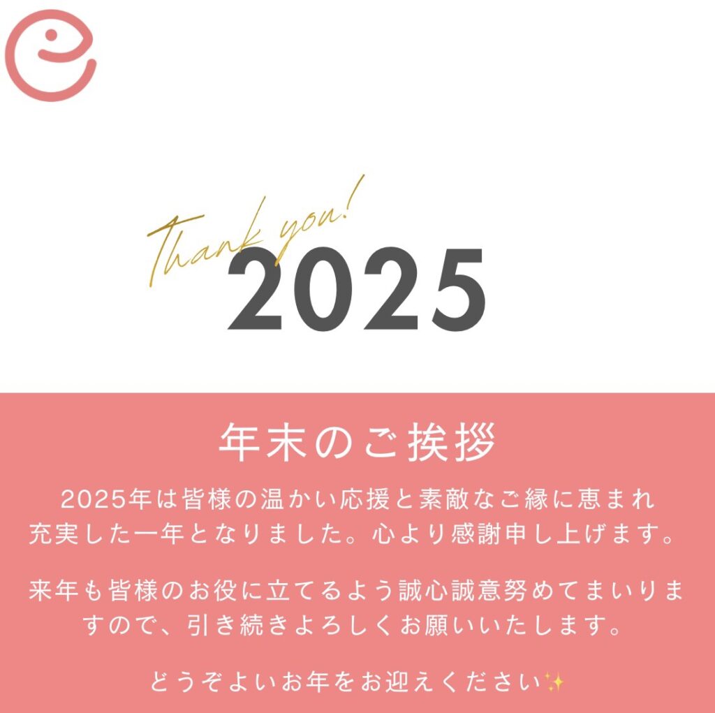 年末のご挨拶 2025-12-30 最終更新日時 : 2025-12-28 投稿- 笑みだち会 2025年も残すところわずかとなりました。 本年は皆様から例年以上のご尽力を賜りましたこと心より感謝申し上げます。 来年もよろしくお願い申し上げます。時節柄ご自愛のうえ良いお年をお迎えください!