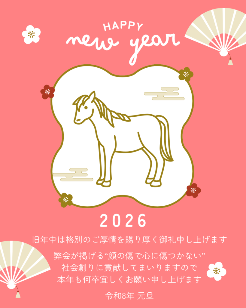 新年のご挨拶 2026-01-01 最終更新日時 : 2025-12-31 投稿- 笑みだち会 あけましておめでとうございます🐎✨旧年中は格別のご厚情を賜り厚く御礼申し上げます。弊会が掲げる”顔の傷で心に傷つかない”社会創りに貢献してまいりますので本年も何卒宜しくお願い申し上げます🌺