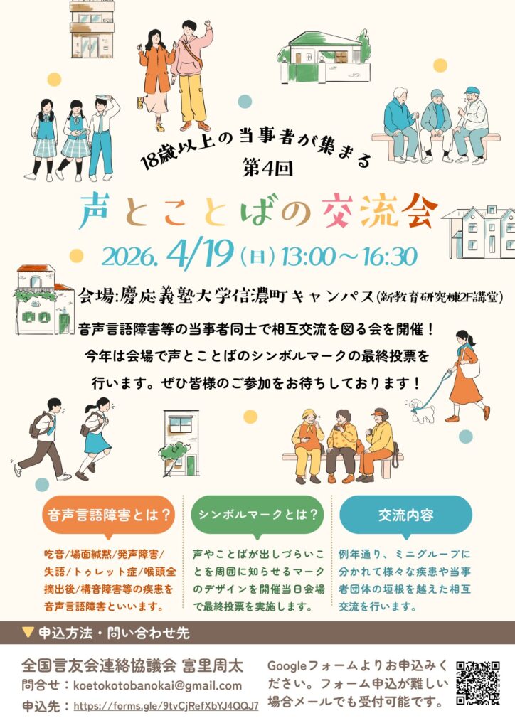全国言友会連絡協議会主催の『声とことばの交流会』が2026年4月19日(日)13:00~16:30、慶応義塾大学信濃町キャンパス(新教育研究棟2F講堂)にて行われます。弊会も運営として参加いたしますので口唇口蓋裂等による構音障害でお悩みの当事者にもご参加いただきたくご案内いたします。また当日の会場では、声とことばのシンボルマークの最終投票を実施予定です。ぜひ皆様にとって有意義な機会になりますよう願っております!ご不明な点がございましたら、お気軽にお問い合わせください。