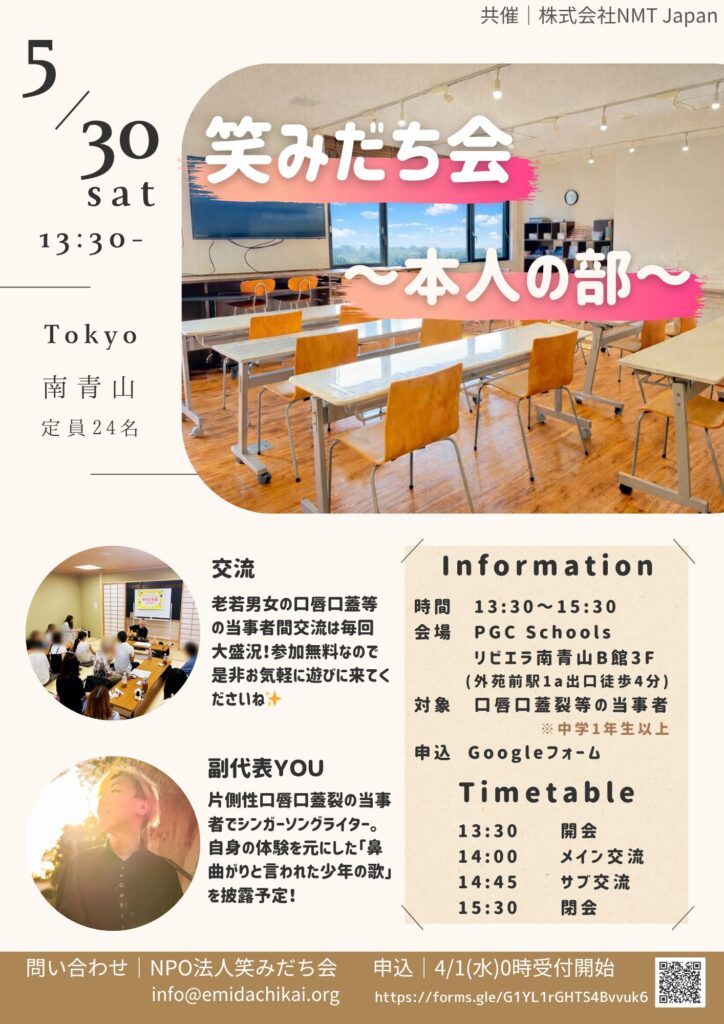 この度、株式会社NMT Japan様(https://nmtgroup.jp/)との共催で2026年5月30日(土)笑みだち会~本人の部~in東京を開催いたします!