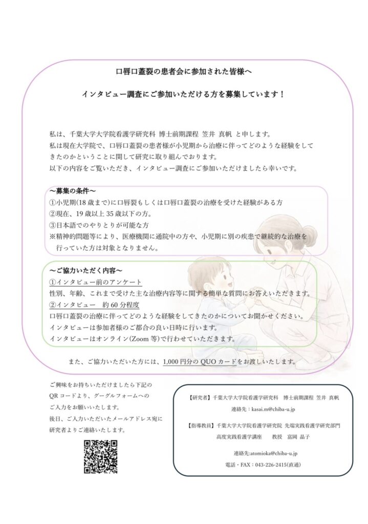 研究者自身も口唇裂の当事者であり、某病院の小児科で看護師として従事した経験から、小児期の心理を看護視点で研究されるそうです。以下の概要欄またはチラシ画像をご確認ください。皆様のご協力を何卒宜しくお願いいたします!
